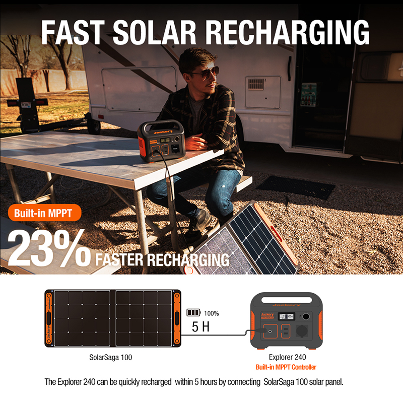 Productomschrijving: Jackery Explorer 240 ComboMet de Jackery Explorer 240 combo heb je altijd toegang tot energie, waar je ook bent. Deze draagbare energiecentrale is compact en gemakkelijk mee te nemen, dankzij de vaste handgreep. Jackery staat bekend om zijn robuuste krachtcentrales die betrouwbaar en duurzaam zijn. De Jackery 240 kan worden opgeladen via het lichtnet of met zonnepanelen, dankzij de ingebouwde MPPT-controller die zorgt voor een maximaal rendement.